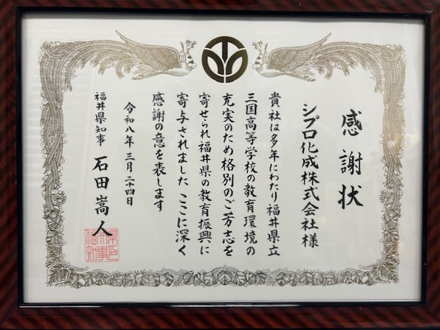 福井県知事 石田嵩人様より、福井県立三国高校への長年の寄附活動に対して感謝状